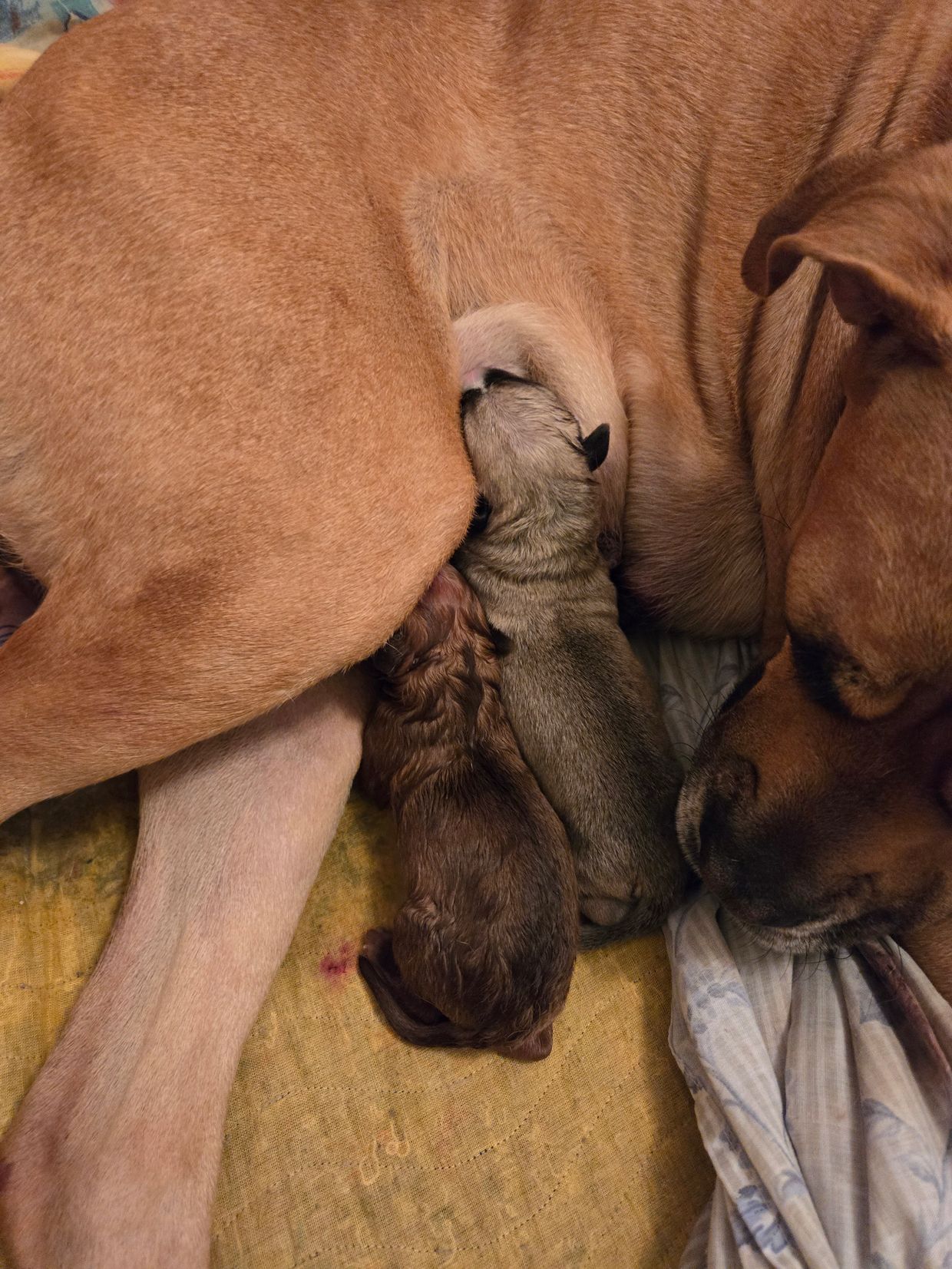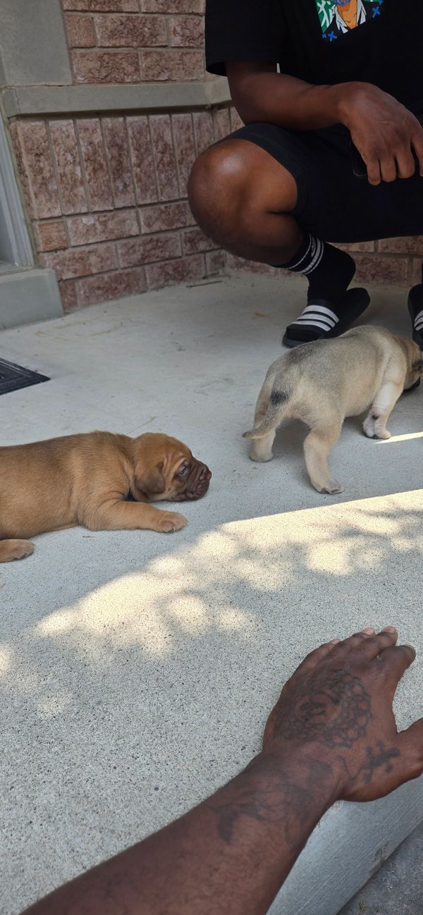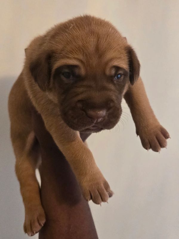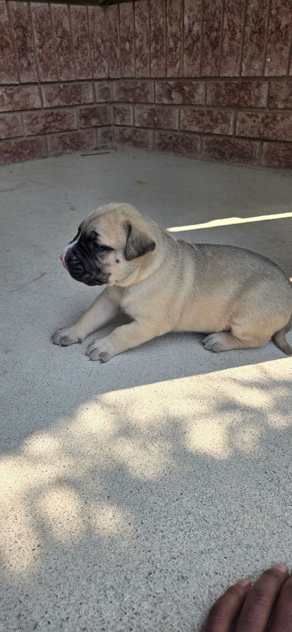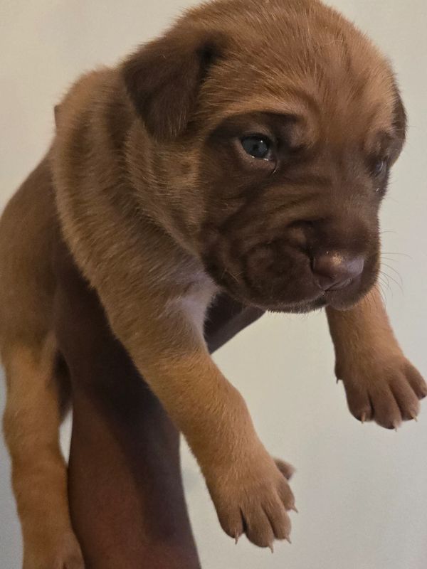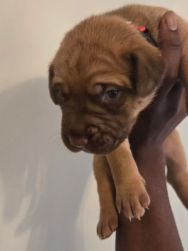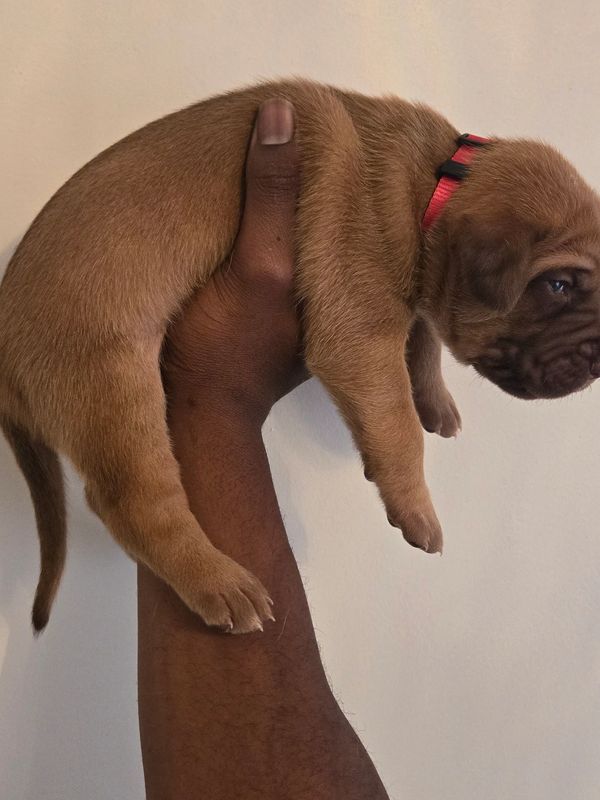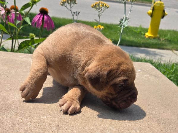 Our charming female pup is a beautiful red fawn with a sweet brown mask, exuding both elegance and strength. She is poised to be as strong, powerful, and explosive as her mother, while also inheriting her friendly, affectionate, and caring nature. This little girl will make a wonderful addition to any home, providing endless joy and companionship.
